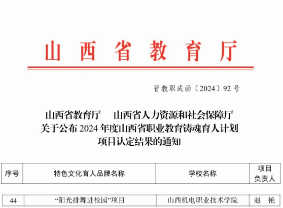 近日,山西省教育厅、山西省人力资源和社会保障厅公布2024年度山西省职业教育铸魂育人计划项目认定结果,我部“阳光排舞进校园”项目入选2024年度山西省职业教育铸魂育人计划项目。近年来,我们积极探索将体育育人纳入“三全育人”的有效途径,多途径、多渠道开展“阳光排舞”进校园的活动,在我部门教师赵艳的带领下取得了丰硕成果。